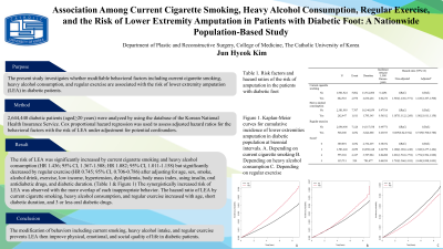 Methods: 2,644,440 diabetic patients (agedā„20 years) were analyzed by using the database of the Korean National Health Insurance Service. (Table 1) Cox proportional hazard regression was used to assess adjusted hazard ratios for the behavioral factors with the risk of LEA under adjustment for potential confounders.