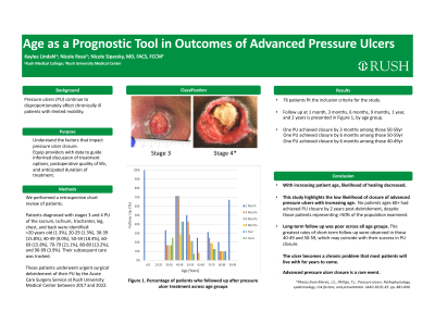 Introduction: Pressure ulcers (PU) continue to disproportionately affect chronically ill patients with limited mobility. Despite the high incidence of PU, there remains a lack of information available on outcomes of patients with PU. Similarly, it remains unclear what impact, if any, demographic factors, such as age, have on PU outcome. Without this information, it is difficult for providers to accurately inform patients of what to expect, including the postoperative quality of life and likelihood of PU closure.