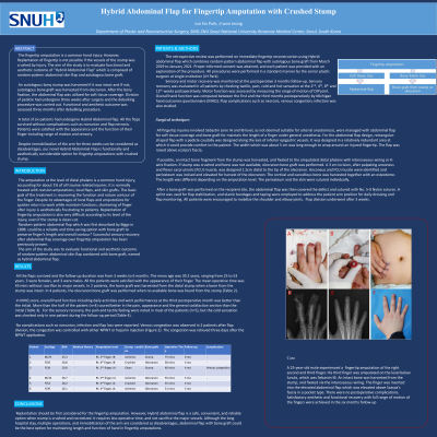 Introduction: Amputation at the level of the distal phalanx is a common hand injury and is normally treated with replantation. However, if the level of injury is distal or the vessels of the stump have been crushed by injury, replantation cannot be a viable option. The aim of this study is to evaluate the functional and aesthetic outcomes of the ‘Hybrid Abdominal Flap,’ which consists of a random-pattern abdominal skin flap and an autologous bone graft.