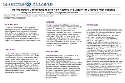 Introduction: Diabetic foot is one of the most common and serious complications of diabetes, and is the main cause of amputation and even death in diabetic patients. Prompt surgical intervention is directly associated with a good prognosis. This study is to ascertain perioperative morbidity and identify prognostic factors for mortality among diabetic foot patients who undergo relative surgical management.