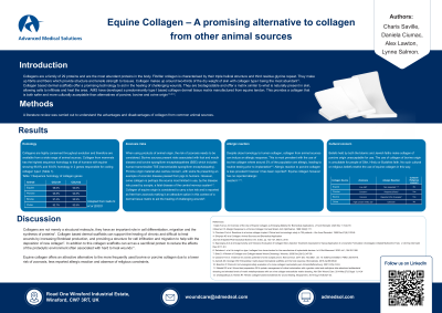 Results: Collagen Type I is highly conserved throughout evolution and is therefore available from a number of animal sources. Many of the products currently available on the market are derived from collagen of bovine or porcine origin which presents a number of concerns. The major one of which is the risk of zoonosis from collagen of both porcine and bovine origin and has drastically hindered the use of ovine collagen, due to susceptibility to scrapie. A second concern is that of allergic reaction, and it has been found that approximately 3% of the population show allergic rection to bovine collagen. Additionally cultural and religious beliefs around the use of porcine and bovine animals can present challenges and limit their application. The use of Equine collagen however can mitigate several of the concerns presented above. There is much less concern around zoonosis from equines and no allergic reaction has been reported against equine collagen. Equine collagen also shows a higher homology to human collagen than porcine, making it an attractive alternative for the manufacture of biomaterials