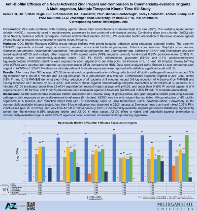 Methods: CDC Biofilm Reactors (CBRs) create robust biofilms with strong bacterial adhesion using circulating bacterial broths. The acronym ESKAPE represents a broad range of common, virulent nosocomial bacterial pathogens: Enterococcus faecium, Staphylococcus aureus, Klebsiella pneumoniae, Acinetobacter baumannii, Pseudomonas aeruginosa, and Enterobacter spp. Biofilms of ESKAP and Escherichia coli were tested against AZ100 and multiple other irrigants: 0.9% normal saline (NSS/negative control), hand-mixed 0.35% povidone-iodine (0.35%PI/positive control), and commercially-available sterile 0.5% PI, 0.05% chlorhexidine gluconate (CHG), and 0.1% polyhexamethylene biguanide/betaine (PHMB/B). Biofilms were exposed to each irrigant (n=3 per data point) for intervals of 5/15/30 minutes. Colony forming units (CFUs) were counted and reported as log-reductions of CFUs compared to NSS. Data were analyzed using Student’s t-test comparing each irrigant to AZ100 to 0.35%PI. P-values were reported with statistical significance set at 0.05.