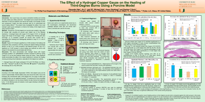 Introduction: Burn wound injury can produce substantial morbidity and mortality for both civilians and military personnel. 1 Third-degree burns include full thickness destruction of both the epidermis and dermis that results in the develop of scars and contractures.2 Copper has been previously used for it’s antimicrobial and wound healing effects. 3,4 The present study investigated the ability of two novel hydrogel copper gauze prototypes to enhance the healing of third degree burns using a porcine model.5