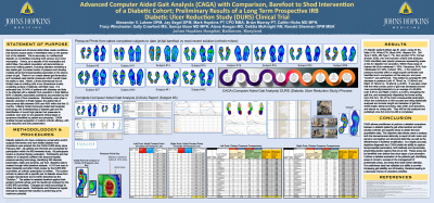 Results: 27 diabetic patients [Mean age 61 years- range 34-84, Male: 81%, White 67%, Black 30%, Hispanic 3%. DM Type 2: 93%, DM Type 1: 7%, Non-smoker: 67%, Former smoker: 33%], who met inclusion criteria were analyzed. CAGA identified peak plantar pressures representing areas at risk for diabetic foot ulceration. Within these areas of highest risk (Submetatarsal 1: 33%, Heel: 24%, Submetatarsals 3,4: 20%, Cuboid: 13%,…), the maximum pressure recorded within a single square centimeter was identified and a comparison of this area pre- and post-“solution” was performed. This yielded an average 64.83% decrease in pressure (Right: 45.0nm2 vs. 13.2nm2 and Left: 46.1nm2 vs. 13.4nm2. p< 0.001). Six of the most consequential parameters which are contributory to this success are being statistically analyzed and include: length and deviation of gait line, stride length, lateral symmetry, step width, foot abduction, and stance vs. swing ratio.