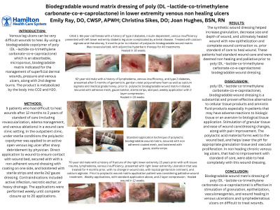 Discussion: poly (DL –lactide-co-trimethylene carbonate-co-e-caprolactone), biodegradable wound dressing is a substantial and proven effective alternative to cellular tissue products and those who may have adverse reactions to biologic tissue or an aversion to biological tissue application. The polylactic acid material conforms well to the wound bed, and helps lower the pH, to provide an optimal environment to stimulate granulation tissue and vascular proliferation which allowed complete epithelialization and healing of these difficult non healing venous ulcers.