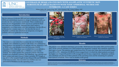 Results: 104 patients were admitted with biopsy proven SJS/ TENS between November 2016 and November 2021. Of the patients admitted, five adult patients had alloplastic synthetic skin substitute applied to their open wounds. The patients ages ranged from 26 to 76 years and %tbsa skin involvement ranged from 20% to 50%. Admission SCORTEN scores ranged from 1-4 which the oldest patients scoring at the higher end. Hosp LOS and ICU LOS averaged 22 and 16 days, respectively. Alloplastic synthetic skin substitute was placed on three patients in the operating room and the remaining two patients had it placed at bedside. There were no deaths in this group.