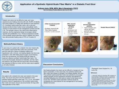 Discussion: Non-healing diabetic foot ulcers can be difficult to manage and may lead to amputation. In this case study, the synthetic hybrid-scale fiber matrix was utilized to manage a non-healing diabetic foot ulcer. The synthetic hybrid-scale fiber matrix was selected to encourage cellular ingrowth and the engineered resorption rate allowed for controlled offloading from the matrix to newly formed tissue at the wound site. Synthetic hybrid-scale fiber matrices should be considered as a novel solution for the management of non-healing diabetic foot ulcers.