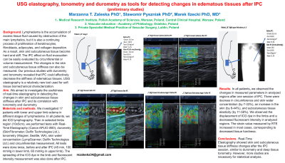 Methods: . We investigated 17 patients with lower and upper limb edema in different stages of lymphedema. In all patients, we did ICG lymphography. Then in selected limbs region (10x5cm), we performed tests with Real-Time Elastography (Canon APLIO i800), durometry (SkinFibrometer; Delfin Technologies Ltd.), tonometry (Wagner, Seattle, WA), skin water concentration (LympScanner; Delfin Technologies Ltd.) and circumferential measurement. All tests were done twice, before and after IPC (45 min, 100 mmHg in lower limb, 60 mmHg in upper limb). The spreading of the ICG dye in the limb and fluorescent intensity measurement was also done after IPC.