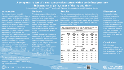 Introduction: Compression therapy is used in managing conditions that heavily affect a patient’s quality of life, but the intended dosage is rarely met. Testing bandage appliers has shown pressures ranging from 6 to 173 mmHg (Heyer et.al., 2017). Applying the correct pressure and achieving a graduated compression profile may seem impossible for most appliers. Furthermore, it’s sometimes advocated to apply bandages with higher pressure than the desired dosage, to compensate for the pressure drop experienced during edema reduction. This unquantified higher pressure may, however, cause pain or tissue damage. An ideal compression product should maintain a safe and tolerable low resting pressure and a high, effective working pressure. The aim was therefore to compare a new compression system to traditional four-component and zinc-based systems over four consecutive days.