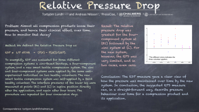 Introduction: Compression treatment is much more than just a single number of interface pressure. For this reason, measures as the Static Stiffness Index ought to be monitored in studies of compression products. The use of stiff systems today is well known to give a boost to the so-called ‘massaging pumping effect’, therefore improving the ejection fraction. Stiff systems are characterized by the fact that the pressure increases drastically if limb girth increases. However, the backside of the coin is that the stiffness will make the pressure drop rapidly if a limb’s girth decreases. Hence, a measure to evaluate an applied compression system should monitor the change of pressure over time. The aim in this study is therefore to evaluate Relative Pressure Drop, RPD, as a new measure of compression product performance.